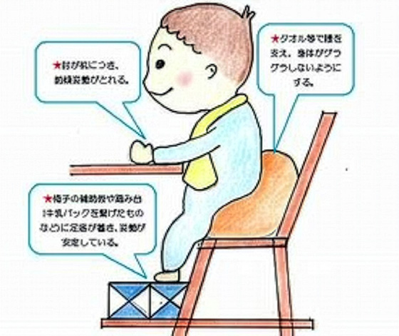 スプーンを横にしてすすり飲んでみましょう。写真のものより少し大きくてもよいです。食事姿勢も大切です。足を着けて、肘の位置が高くならないように、背中にタオルなどを入れるなど、しっかり姿勢の管理してあげましょう。