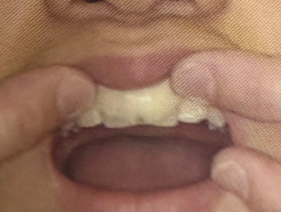 ガムを丸めて上の前歯の外側(上唇と前歯の間)において、上唇で前歯に押し付けます。これを5回繰り返します。