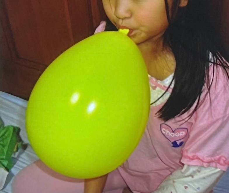 口だけ使ってゴムの膨らませてみましょう。口だけで膨らませるのが難しいなら、最初は指で支えてもよいです。それができたら、口だけで。唇の力で風船を把持し、鼻呼吸で風船に空気を入れます。